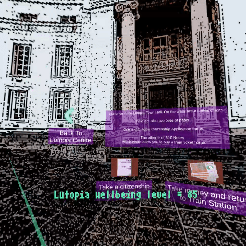 Lutopia attracted local authority and Arts Council funding and was commissioned as a lead project for Luton’s City of Culture bid pilot programme in 2019. It was showcased as part of a public event where the live gameplay was projected on to the Town Hall and used as a prompt for public discussions about what steps to building Lutopia could be taken in the here and now.