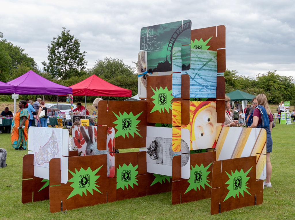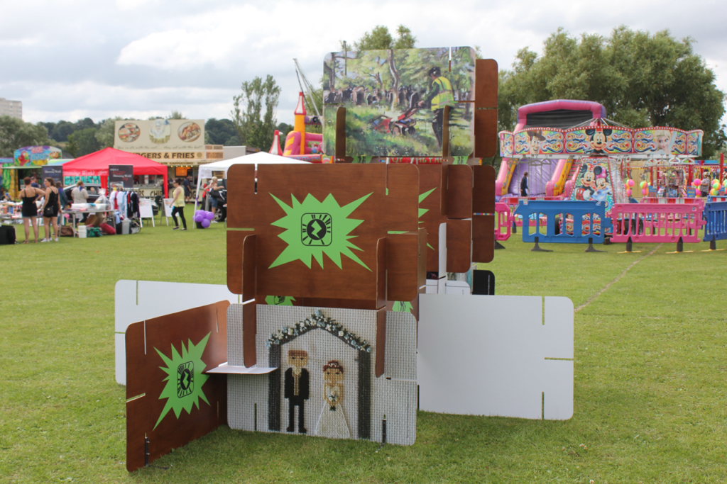 What Makes Gipton? is an interactive sculpture commissioned by East Leeds Project as part of their research about local makers and creative activity. It is made from modular parts that can be assembled in a variety of ways. The panels display images and digital content developed with local people that can be unlocked using an Augmented Reality app on tablets and mobile devices. The sculpture was showcased at Gipton Gala and subsequent public engagement events to facilitate conversations that will feed into the design of a semi-permanent makers space in the area.
